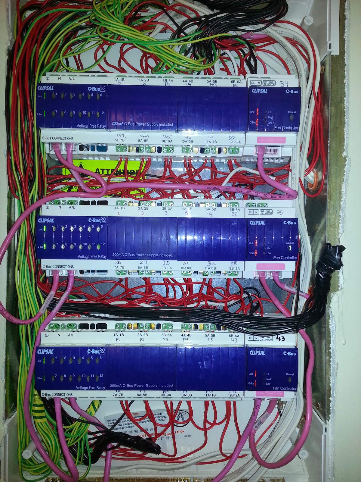 In the picutre below you can also see the cbus pink cable. This is the data cable that links all cbus units. It's basically cat5 with a mains rated insulation on it. Note that the protocol is not TCP/IP, it's proprietary CBUS. So don't try plugging it in to your router!